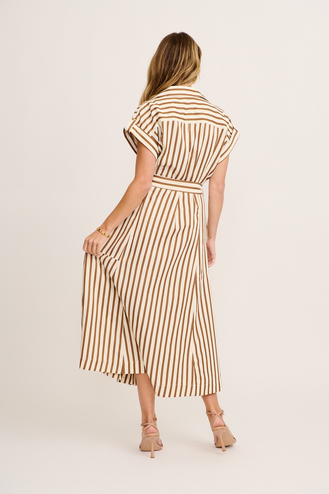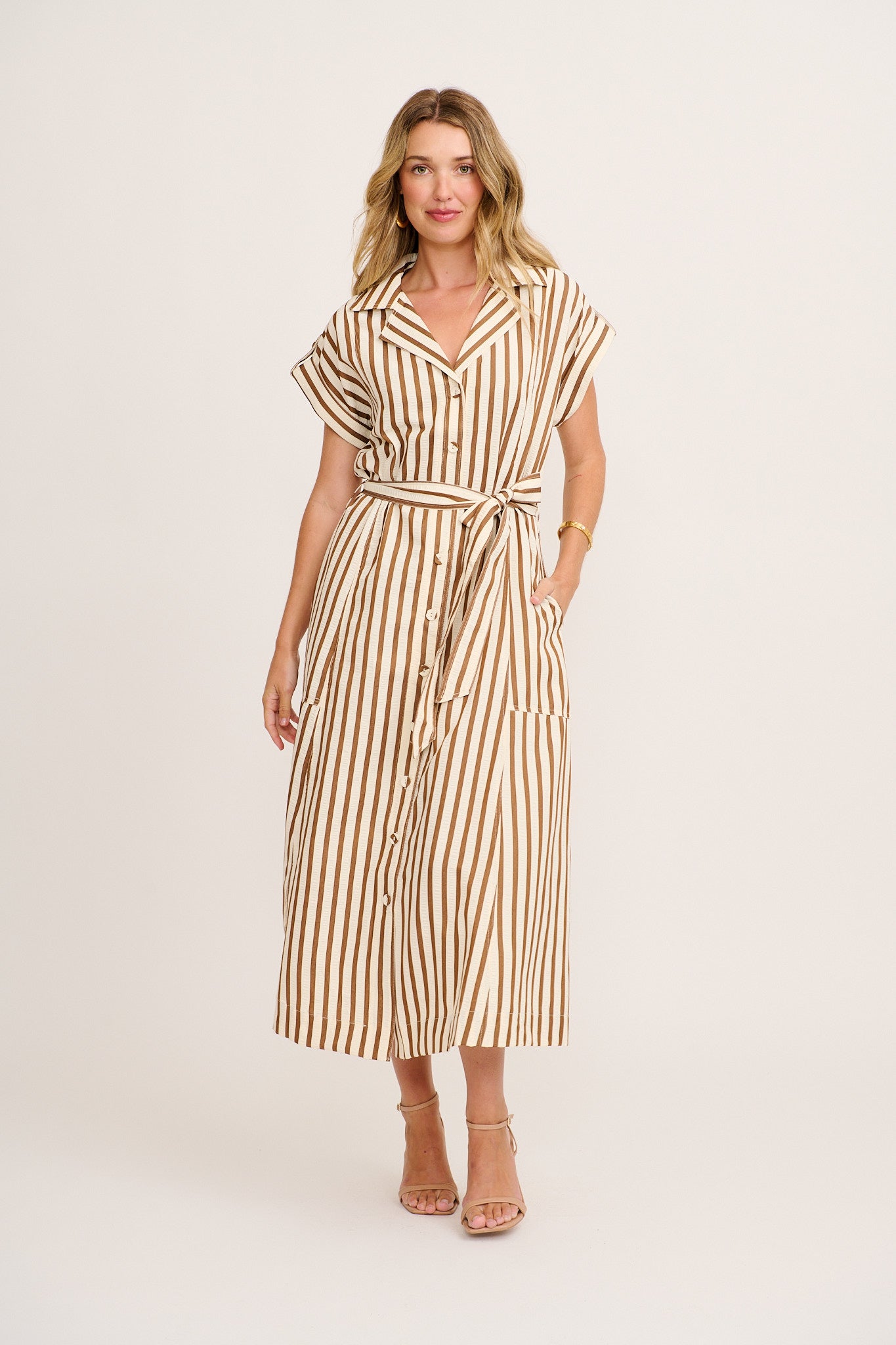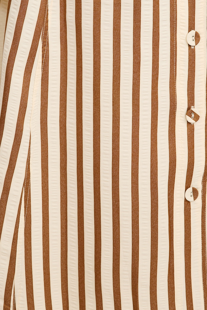 The Arcadia Maxi Shirt Dress in Brown Stripe brings warm tones and relaxed structure together for everyday elegance. Ideal for workwear or casual weekends, its stripe print adds classic polish to its airy silhouette.