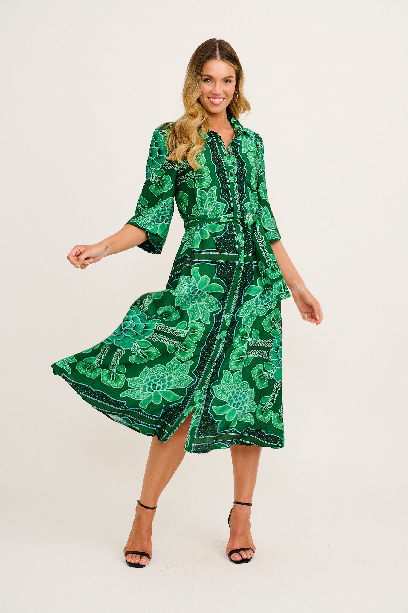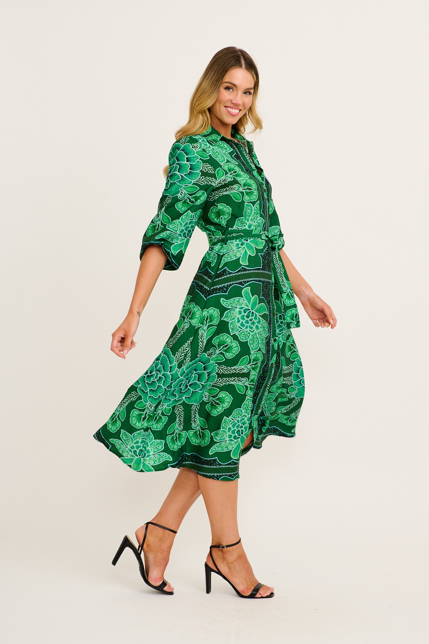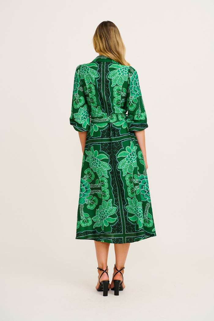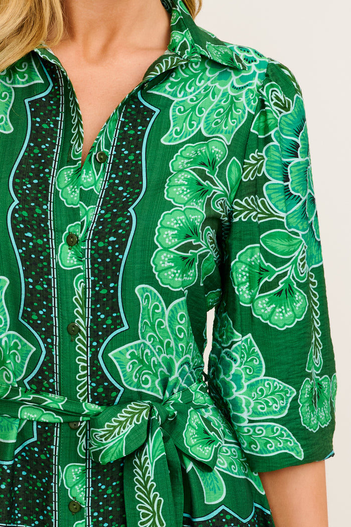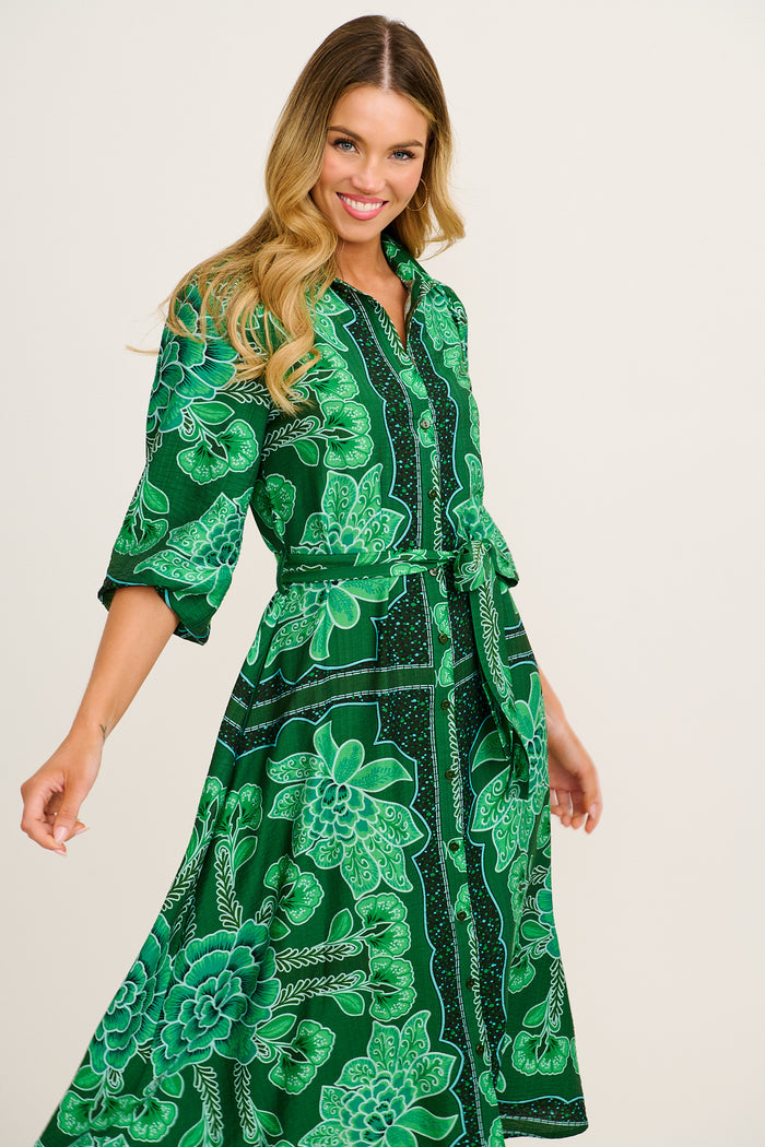 Aurelina Maxi Shirt Dress in Emerald Floral Print Linen Blend