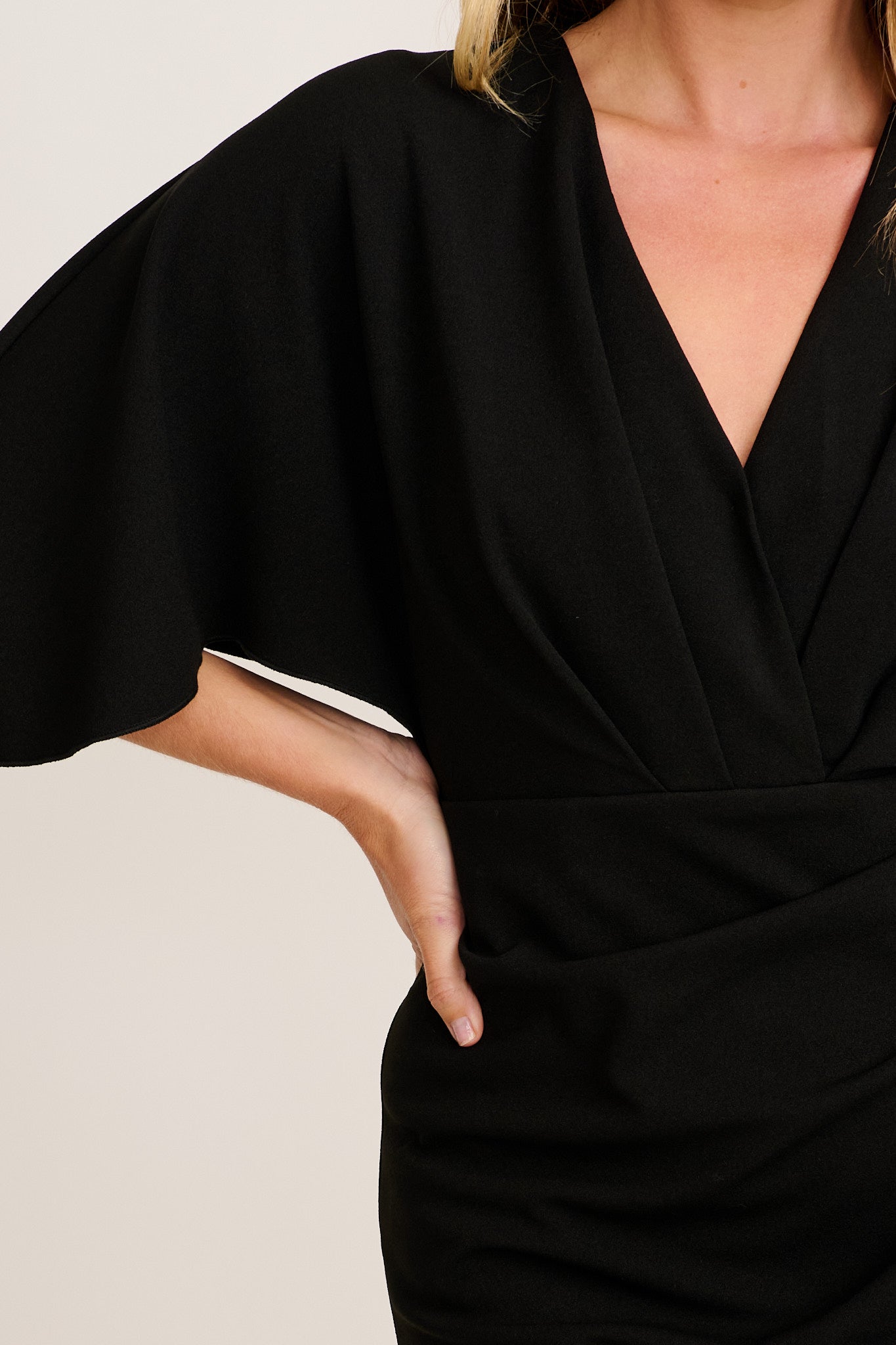 - Grown-on batwing sleeves and mock wrap skirt
